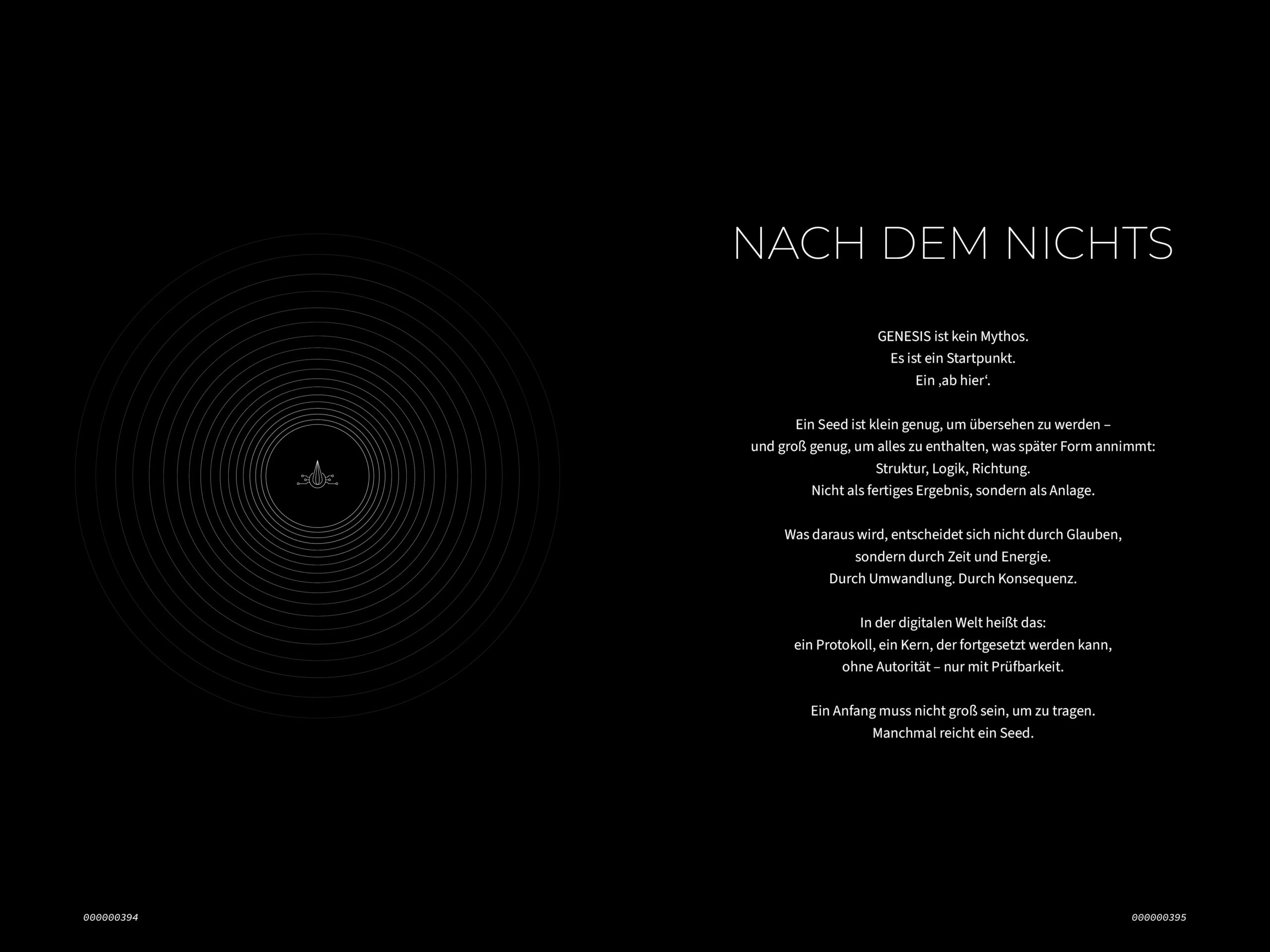 GENESIS SEED ist ein privates Herzensprojekt – entstanden außerhalb meiner Arbeit als Designer und Art Director, aber aus derselben Leidenschaft: Dinge sichtbar zu machen, die unter der Oberfläche wirken. Über viele Monate ist daraus ein Roman geworden, der Thriller-Spannung mit Fragen nach Vertrauen, Wert und Systemen verbindet. Bitcoin war dabei weniger „Thema“ als Auslöser: ein Protokoll, das den Blick auf Technologie, Ökonomie, Philosophie und Gesellschaft neu ordnet. Auf dieser Seite zeige ich Einblicke in das Projekt: Gestaltung, Bilder, Hintergründe und Zusatzmaterial. Wer tiefer einsteigen möchte, findet weiter unten den Link zur Buchseite bei Amazon.