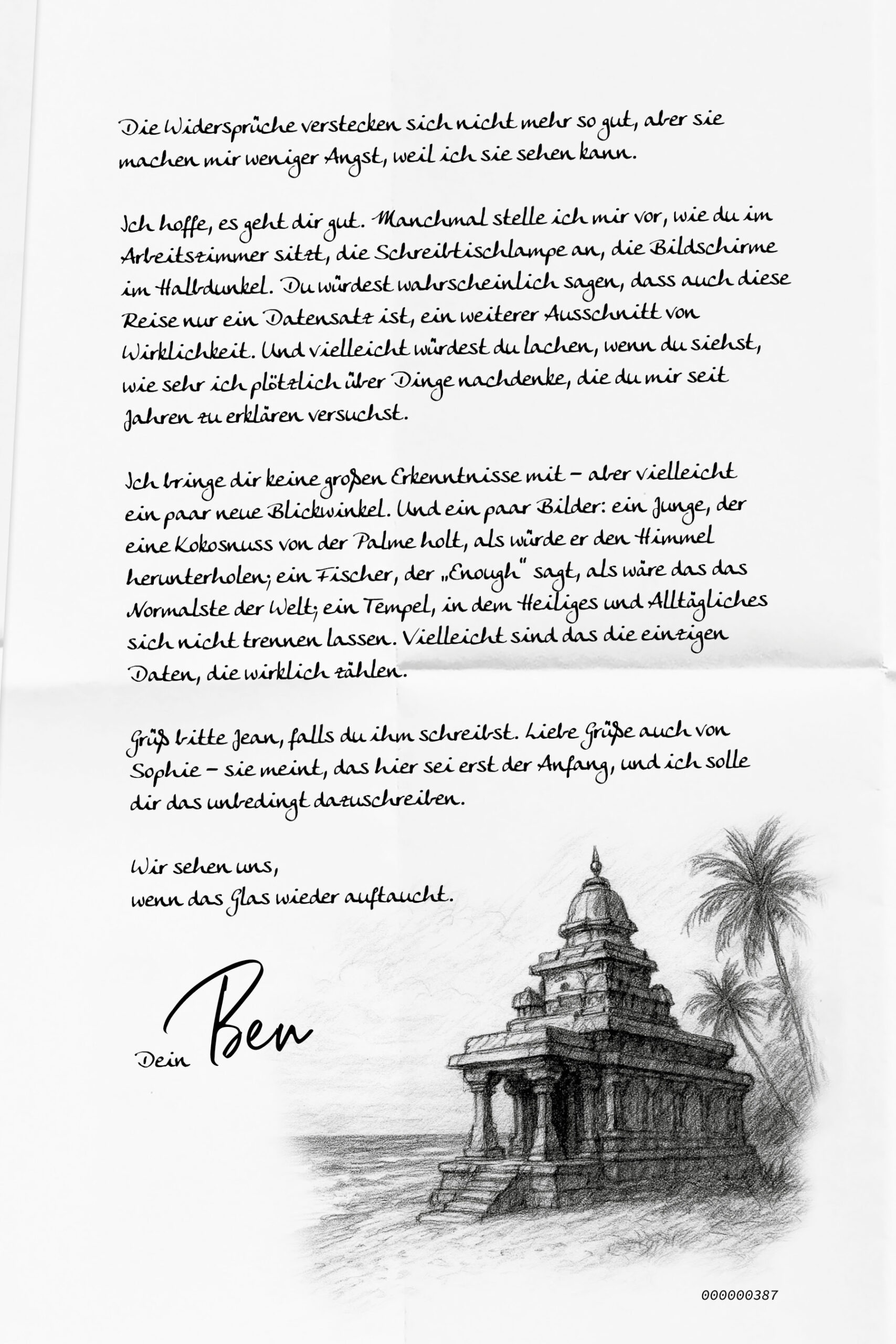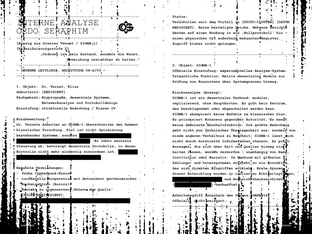 Ben Vernet, Sohn eines verschwundenen Entwicklers, stößt auf eine Spur aus Notizen, Datenfragmenten und verschütteten Verbindungen. Was als persönliche Suche beginnt, führt ihn in ein Geflecht aus Einfluss und unsichtbaren Abhängigkeiten. Je tiefer er gräbt, desto deutlicher wird: Es gibt Interessen, die auf Kontrolle gebaut sind – und die dafür sorgen, dass bestimmte Spuren im Rauschen verschwinden.