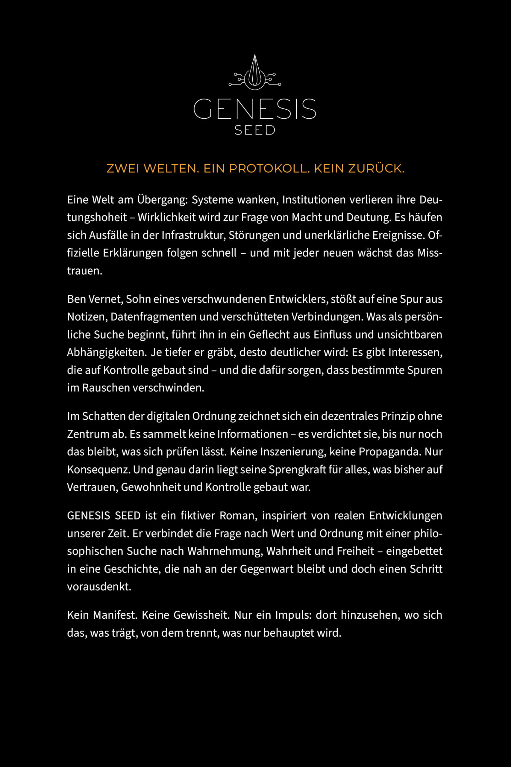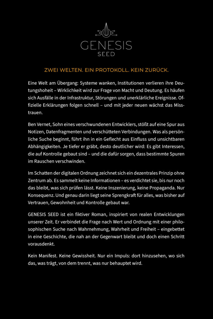 GENESIS SEED ist ein fiktiver Roman, inspiriert von realen Entwicklungen unserer Zeit. Er verbindet die Frage nach Wert und Ordnung mit einer philosophischen Suche nach Wahrnehmung, Wahrheit und Freiheit – eingebettet in eine Geschichte, die nah an der Gegenwart bleibt und doch einen Schritt vorausdenkt.